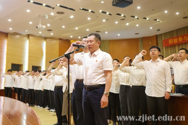 在党委书记劳赐铭领誓下,新发展党员进行入党宣誓,全体与会党员重温入党誓词。大家面对党旗,用铿锵有力的声音表达对党的忠诚和热爱、为党奉献终身的信念和决心。